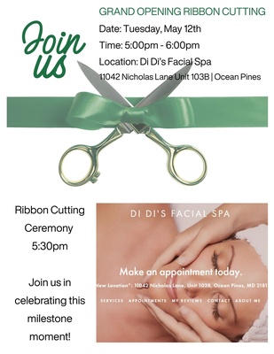 Come celebrate the grand opening of Di Di's Facial Spa on May 12th from 5pm - 6pm at their new location 11042 Nicholas Lane Unit 103B. See their new fabulous space and learn about the many services now available to the Ocean Pines community! Ribbon cutting ceremony at 5:30pm.